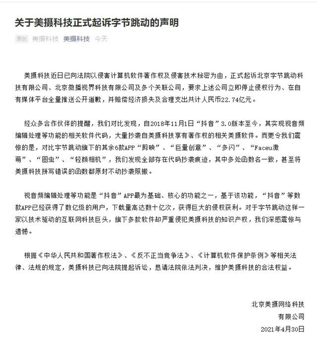 4 月 30 日消息 美攝科技通過其微信公眾號(hào)發(fā)布聲明,稱近日已向法院以侵害計(jì)算機(jī)軟件著作權(quán)及侵害技術(shù)秘密為由,正式起訴北京字節(jié)跳動(dòng)科技有限公司、北京微播視界科技有限公司及多個(gè)關(guān)聯(lián)公司,要求上述公司立即停止侵權(quán)行為、在自有媒體平臺(tái)全量推送公開道歉,并賠償經(jīng)濟(jì)損失及合理支出共計(jì)人民幣 22.74 億元。